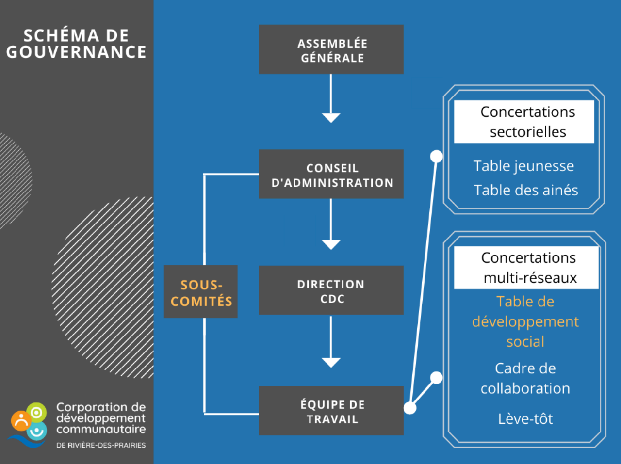 La CDC RDP fait partie du grand réseau des 69 CDC du Québec gouverné par la Table nationale des corporations de développement communautaire (TNCDC) Elle a aussi pour mandat de développer la table du quartier, via la Table de développement social de Rivière-des-Prairies (TDS RDP). La Table de Rivière-des-Prairies compte parmi les 31 TDS de la coalition Montréalaise des tables de quartier (CMTQ)